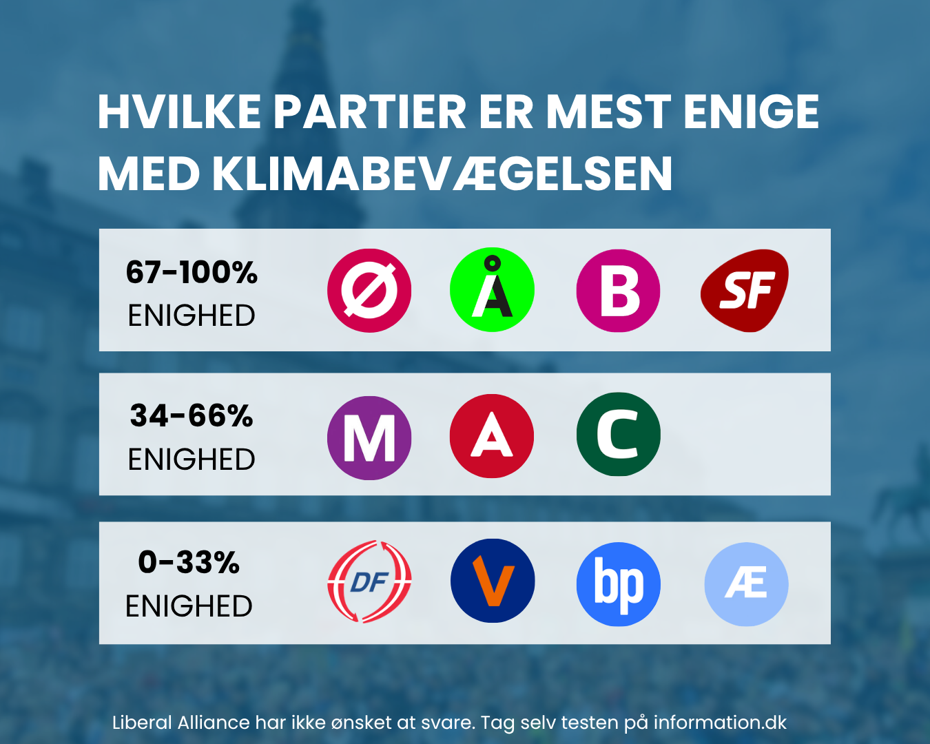Klima og miljø ligger konsekvent højt på de dagsordener som danskerne bekymrer sig mest om. Hele 63% af danskerne siger at klimapolitik med høj sikkerhed eller muligvis vil have en betydning for, hvor de sætter deres kryds. Men hvem fortjener så din grønne stemme?