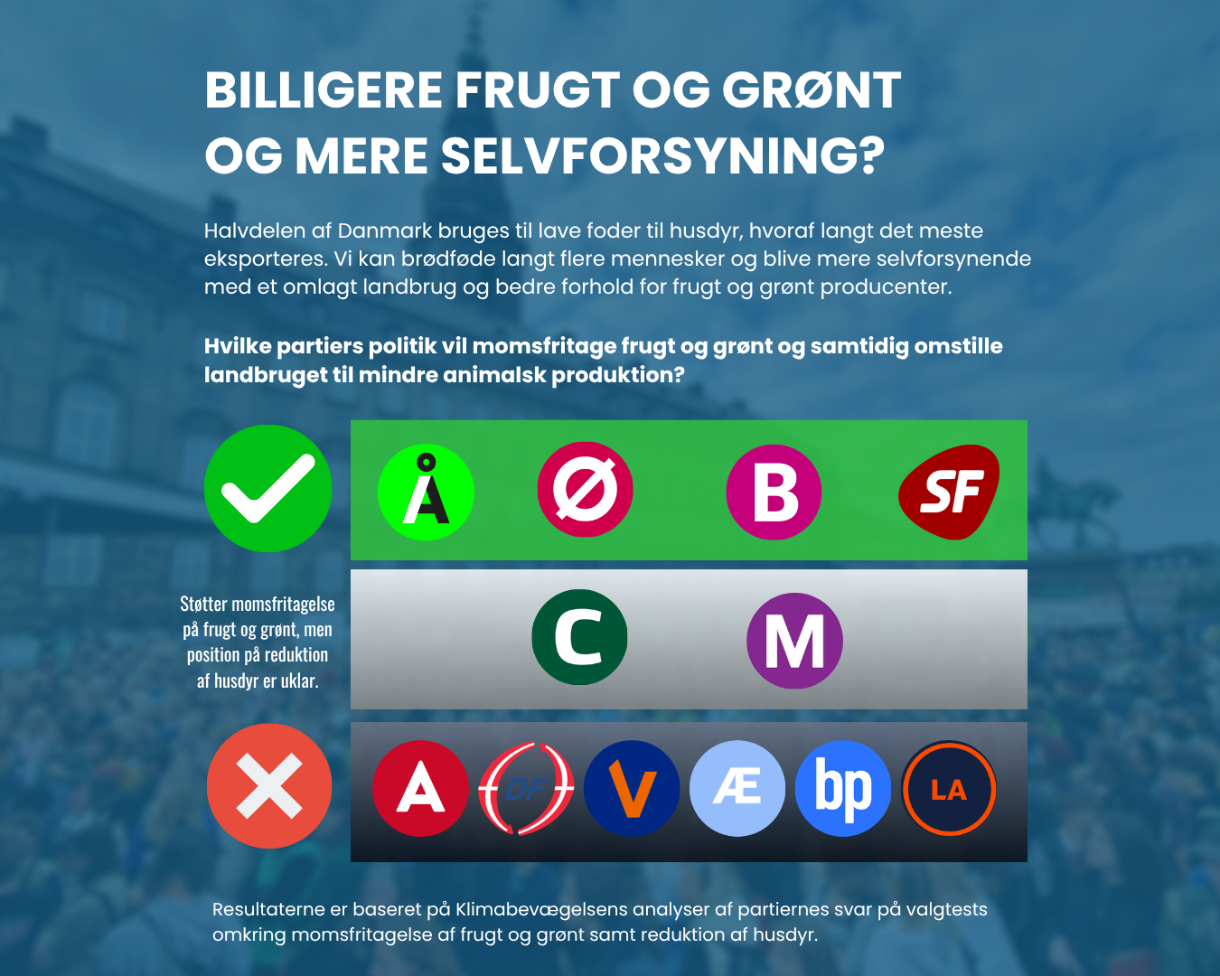 Ved at momsfritage frugt og grønt, kan fødevarepriserne falde, samtidig med at vi giver bedre vilkår for frugt og grønt produktionen. Ved at reducere dyreholdet, kan landbrugsjord frigøres til mad til mennesker og give positive bi-effekter ift. fiskeri, natur og forurening. Men hvilke partier vil det?