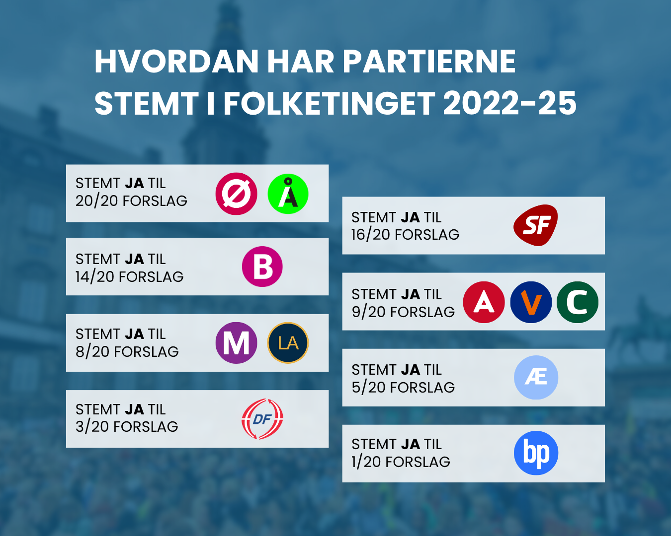 Lad os se hvordan de så har stemt. Klimabevægelsens har valgt tyve grønne folketingsforslag om klima, alle fra årene 2022-2025. Partierne er rangeret efter hvor mange af forslagene de har stemt for.