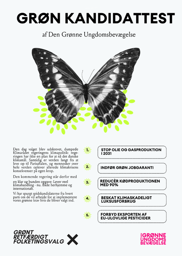 Den Grønne Ungdomsbevægelse har også lavet en spidskandidattest om 5 vigtige spørgsmål, omhandlende olie og gas produktion, grøn jobgaranti, luksus-forbrug, reduktion af kødproduktion og eksport af ulovlige pesticider.