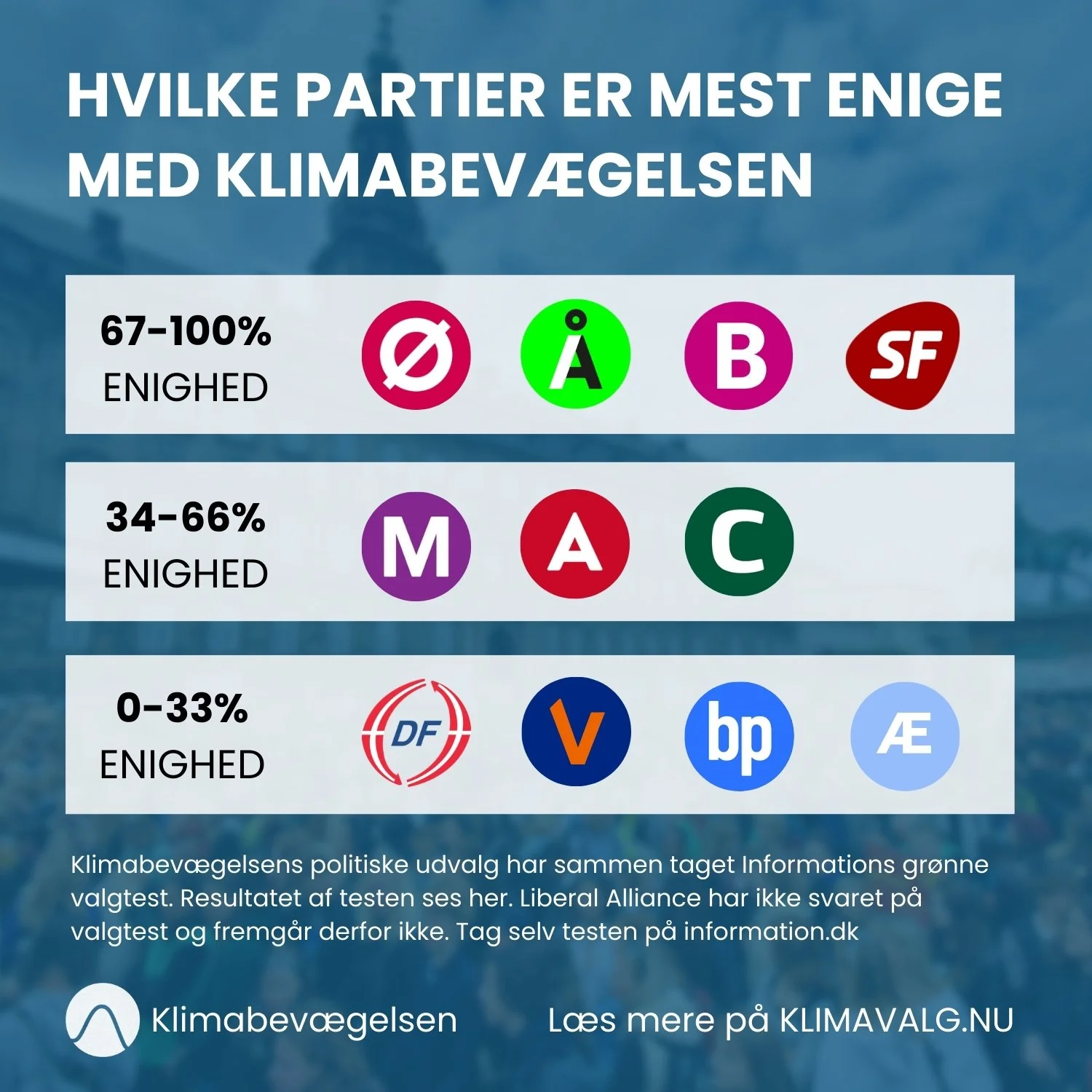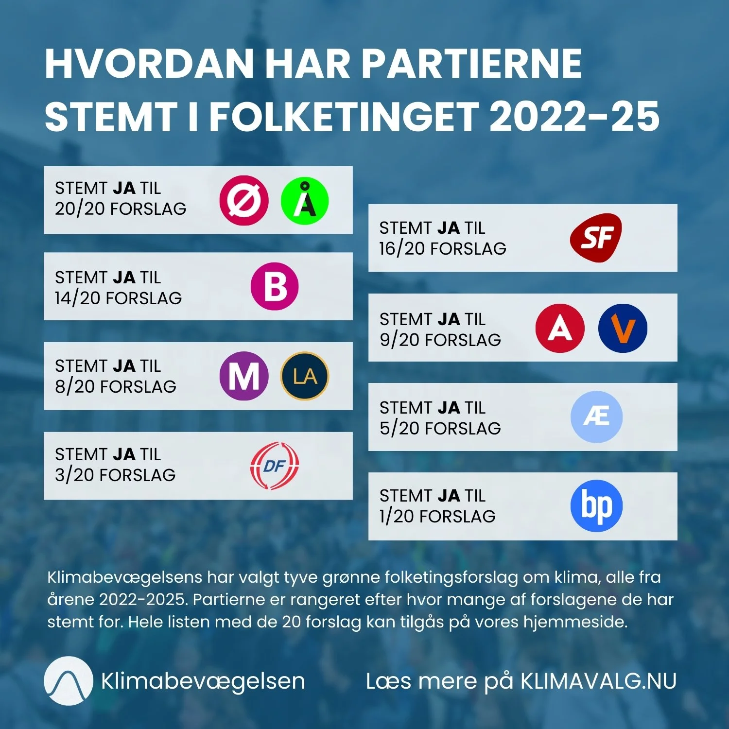 Hvem skal man stemme på? 1. Hvem er mest enig med Klimabevægelsen? Læs mere 2. Hvordan har partierne stemt i Folketinget? Læs mere